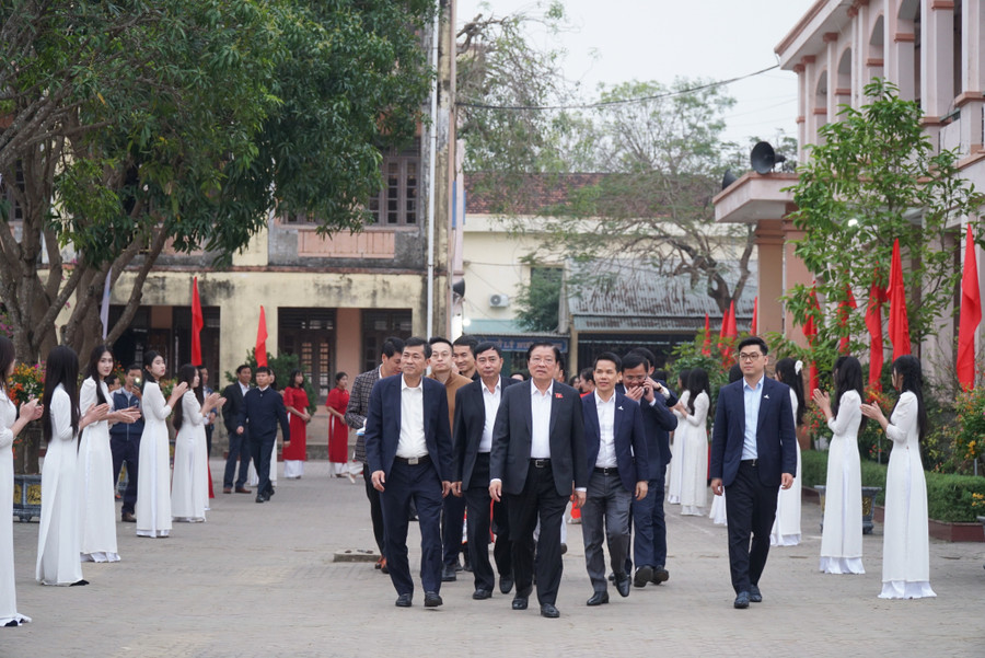 Ông Phan Đình Trạc – Trưởng Ban Nội chính Trung ương và ông Thái Văn Thành, Phó Chủ tịch UBND tỉnh Nghệ An dự lễ khánh thành dãy phòng học tại Trường THPT Nguyễn Xuân Ôn. Ảnh: Hồ Lài