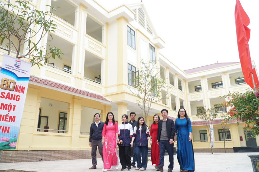 Giáo viên, học sinh Trường THPT Nguyễn Xuân Ôn trước dãy phòng học mới. Ảnh: Hồ Lài.