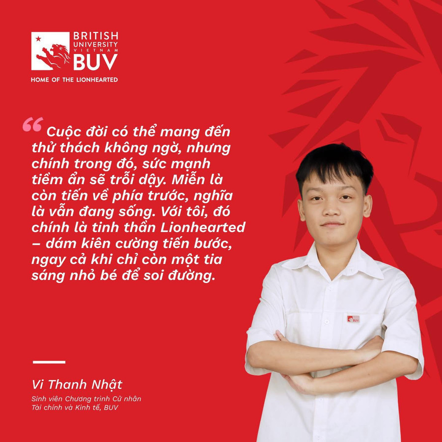 “Cuộc đời có thể mang đến những thử thách không ngờ, nhưng chính trong đó, sức mạnh tiềm ẩn sẽ trỗi dậy. Miễn là còn tiến về phía trước, nghĩa là vẫn đang sống. Với tôi, đó chính là tinh thần Lionhearted – dám kiên cường tiến bước, ngay cả khi chỉ còn một tia sáng nhỏ bé để soi đường”, đó là lời chia sẻ của Vi Thanh Nhật – sinh viên Chương trình Cử nhân tìa chính và Kinh tế, Đại học Anh Quốc Việt Nam.