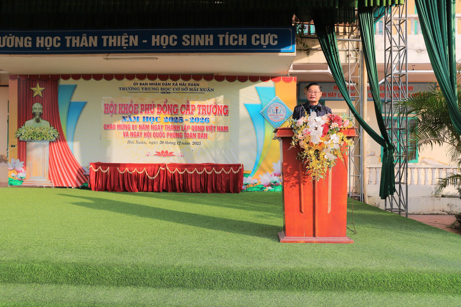 Thầy Nguyễn Hải Sơn, Hiệu trưởng Trường THCS Hải Xuân phát biểu tại Hội khỏe Phù Đổng cấp trường năm học 2025-2026.