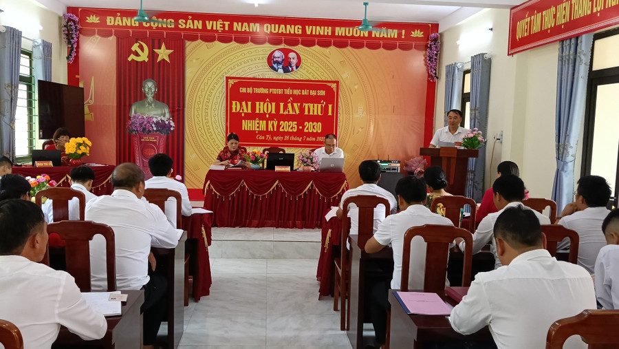 Thầy Nguyễn Văn Hoài phát biểu tại Đại hội Chi bộ nhiệm kỳ 2025-2030 của Trường PTDTBT Tiểu học Bát Đại Sơn (xã Cán Tỷ, Tuyên Quang). Ảnh: NTCC.