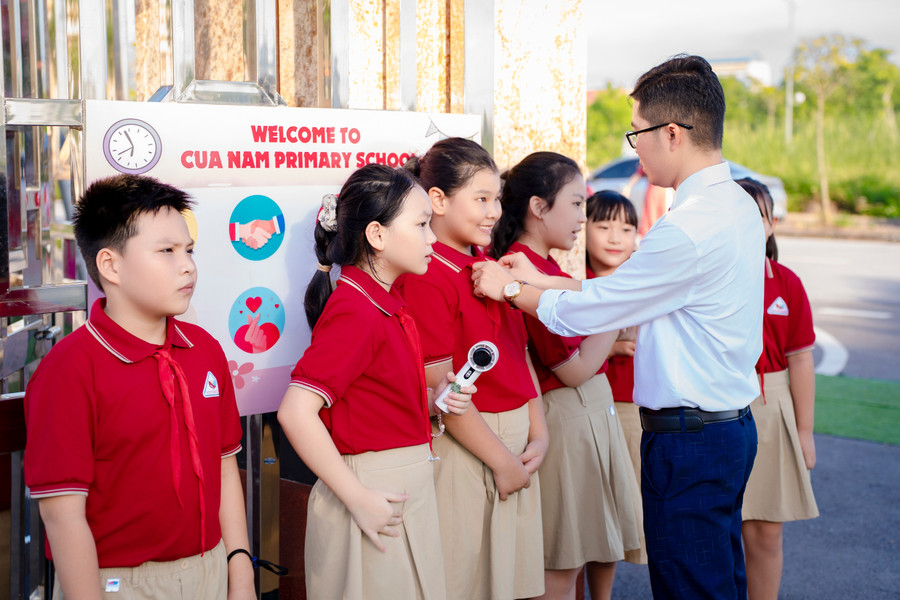 Cô, trò Trường Tiểu học Nguyễn Tất Thành (Nam Định, Ninh Bình) trong ngày khai giảng năm học 2025-2026.