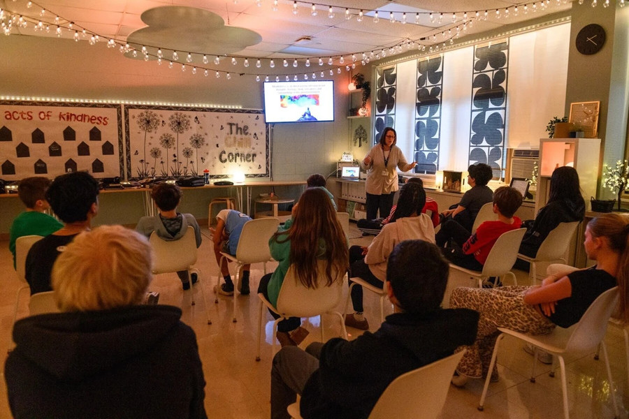 “Vậy… những tác động về thể chất nào có thể xảy ra khi chúng ta căng thẳng?” - cô Shelly Meier, giáo viên sức khỏe tâm thần của Trường Trung học Pleasant Hills, đặt câu hỏi với một nhóm học sinh lớp Bảy trong buổi học Kỹ năng Thư giãn hàng tuần. Cô chiếu các slide về chánh niệm trên màn hình tivi, giải thích đây là việc “chú ý đến suy nghĩ, cảm xúc, cảm giác cơ thể và môi trường xung quanh trong khoảnh khắc hiện tại”.