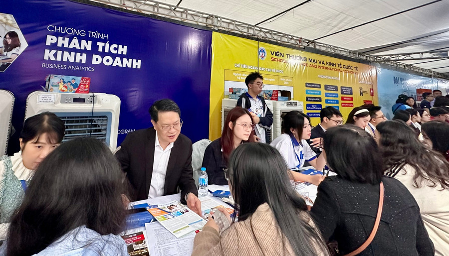TS.Vũ Văn Ngọc - Viện trưởng Viện Đào tạo Tiên tiến, Chất lượng cao và POHE, ĐH Kinh tế Quốc dân tư vấn tuyển sinh cho thí sinh, phụ huynh. Ảnh NC.